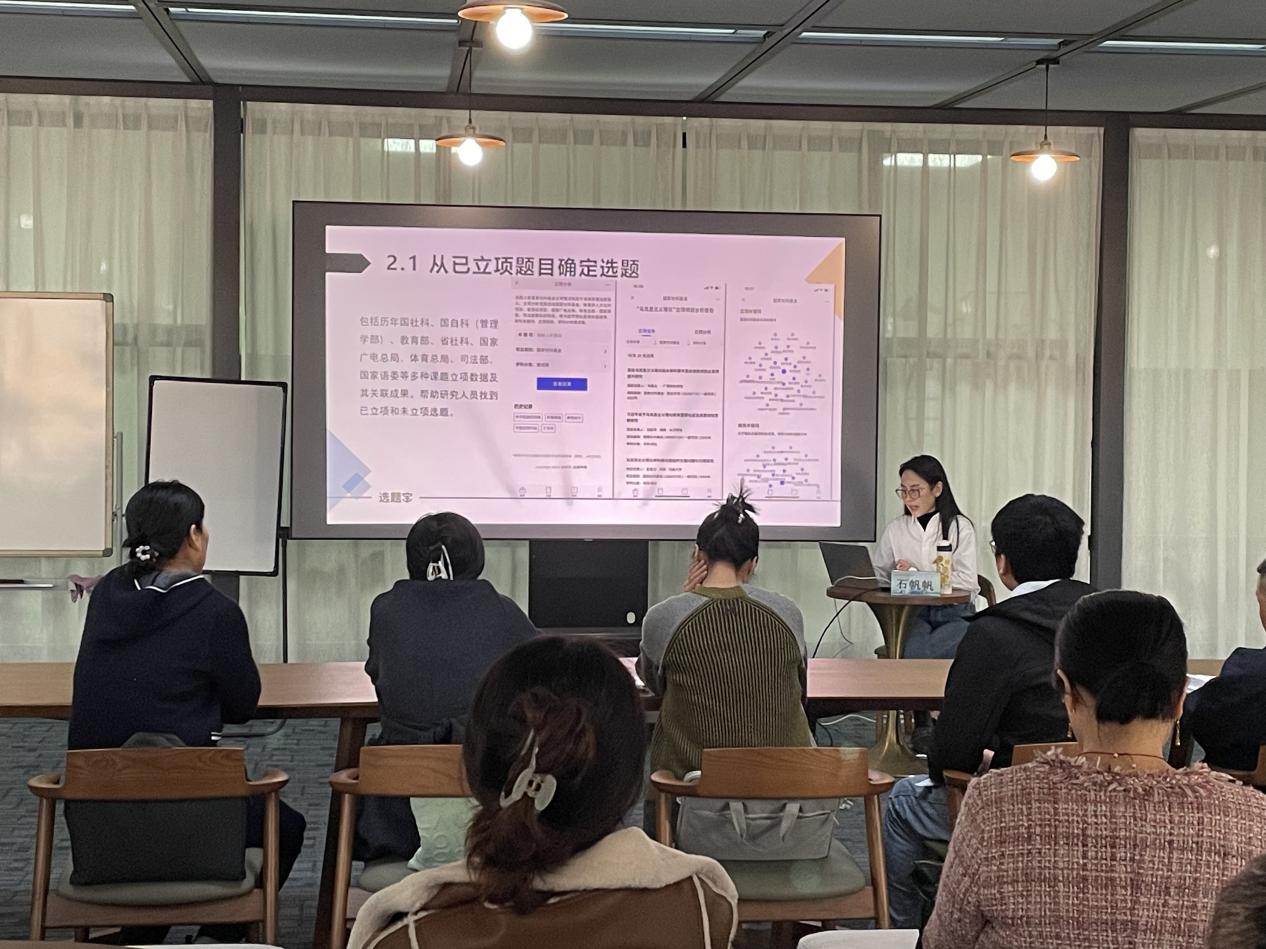 为推动我校教师更好的利用数字资源,助力课题申报,图书馆于11月5日下午16:00-17:30,在图书馆六楼活动室开展了2025年图书馆“与你一起做科研”系列活动(第五讲),主题为“2025年国社科立项分析及2026年选题和申报论证技巧”,图书馆特邀选题宝专业培训讲师石帆帆担任主讲。