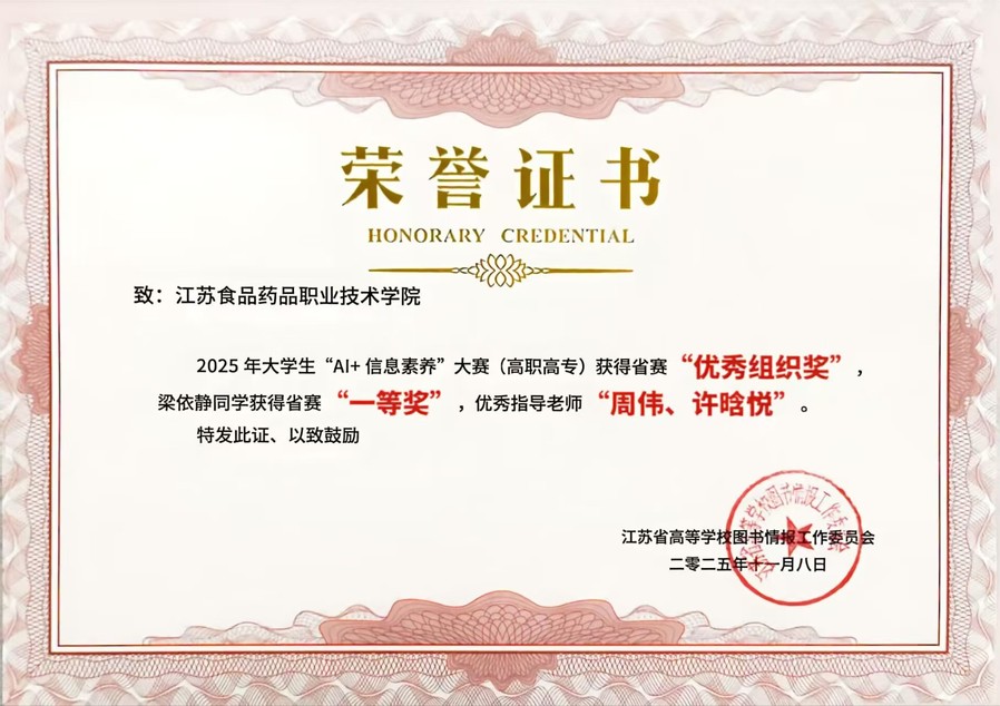 2025 年大学生“AI+ 信息素养”大赛圆满结束,本次大赛由教育部高等学校图书情报工作指导委员会高职高专院校分委员会指导、2025 年大学生“AI+ 信息素养”大赛组委会主办。我校药本241班学生梁依静获江苏省一等奖,图书馆周伟、许晗悦获“优秀指导老师”称号,我校获得“最佳组织奖”。