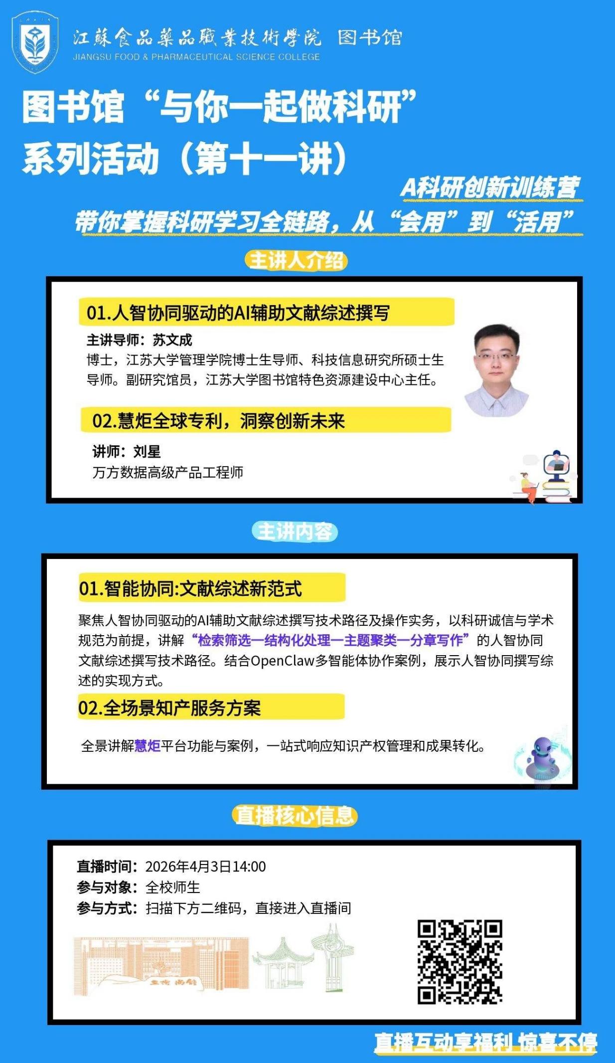 为助力我校教师提升科研素养与创新能力,掌握AI时代科研学习全链路技能,图书馆于4月3日下午2:00-4:00,在线上直播间开展了图书馆“与你一起做科研”系列活动(第十一讲),主题为“人智协同驱动的AI辅助文献综述撰写”和“慧炬全球专利,洞察创新未来”。本次活动特邀江苏大学管理学院博士生导师、科技信息研究所硕士生导师苏文成和万方数据高级产品工程师刘星担任主讲。